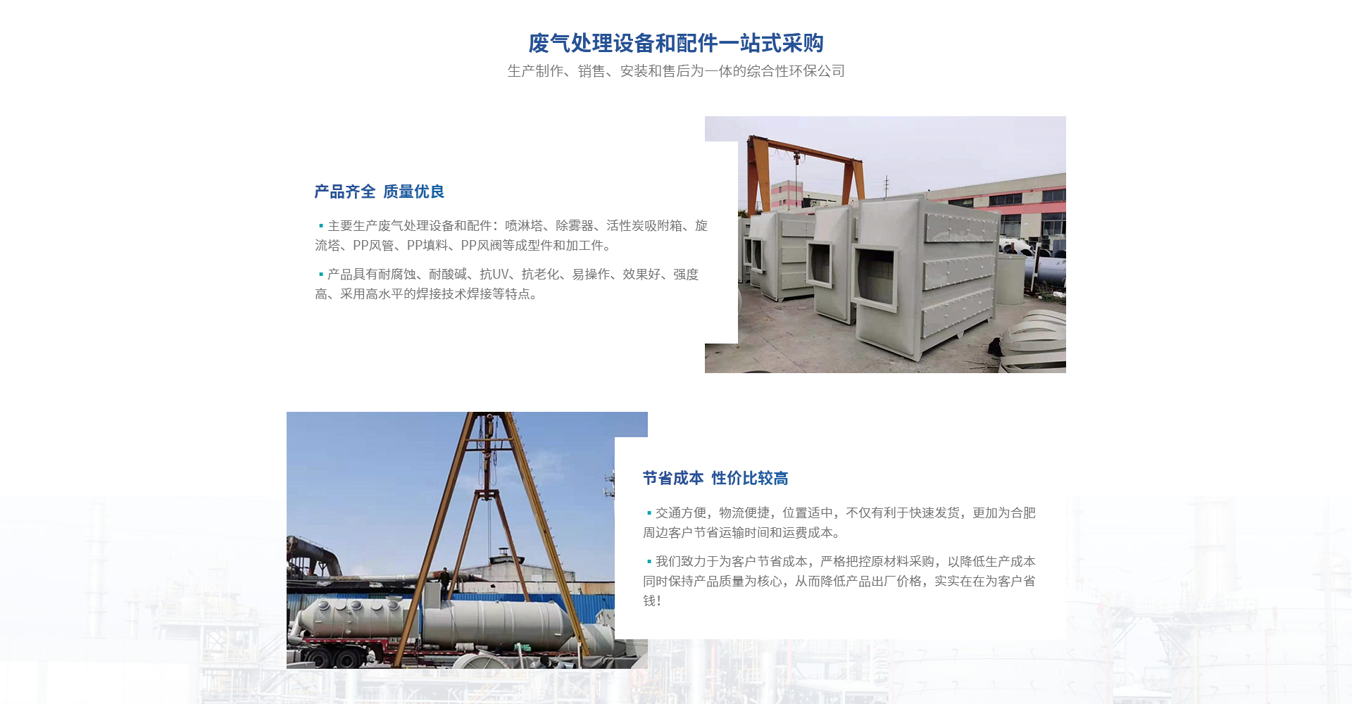 合肥熙誠環??萍加邢薰臼俏跽\環保合肥分公司,是一家集產品生產制作、銷售、安裝和售后為一體的綜合性環保公司。主要生產廢氣處理設備和配件:噴淋塔、除霧器、活性炭吸附箱、旋流塔、PP風管、PP填料、PP風閥等成型件和加工件,產品具有耐腐蝕、耐酸堿、抗UV、抗老化、易操作、效果好、強度高、采用高水平的焊接技術焊接等特點;滿足客戶一站式采購的要求。廣泛應用于電子業、化工業、醫藥業、紡織業、橡塑業、汽車業、...